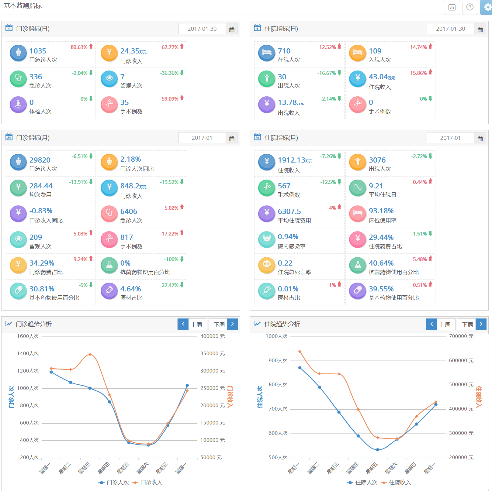 1、门诊人次;2、门诊人次环比;3、门诊人次同比;4、急诊人次;5、急诊人次环比;6、留观人次;7、留观人次环比;8、体检人次;9、体检人次环比;10、门诊收费人次;11、门诊发药人次;12、门诊收入;13、门诊收入环比;14、门诊收入同比;15、门诊手术例数;16、门诊均次费用;17、门诊药费占比;18、门诊抗菌药物使用百分比;19、门诊注射药物使用百分比;20、门诊基本药物使用百分比;21、在院人次;22、入院人次;23、出院人次;24、住院收入;25、出院收入;26、住院手术例数;27、住院天数;28、实际占用床日数;29、实际开放床日数;30、平均住院日;31、床位使用率;32、平均住院费用;33、出院患者医院感染例数;34、医院感染发生率;35、住院药费占比;36、住院均次药费;37、出院患者使用抗菌药物人次;38、住院抗菌药物使用百分率;39、住院使用注射药物人次;40、住院注射药物使用百分率;41、基本药物品种数;42、住院基本药物使用百分率;43、住院总死亡人数;44、住院总死亡率;