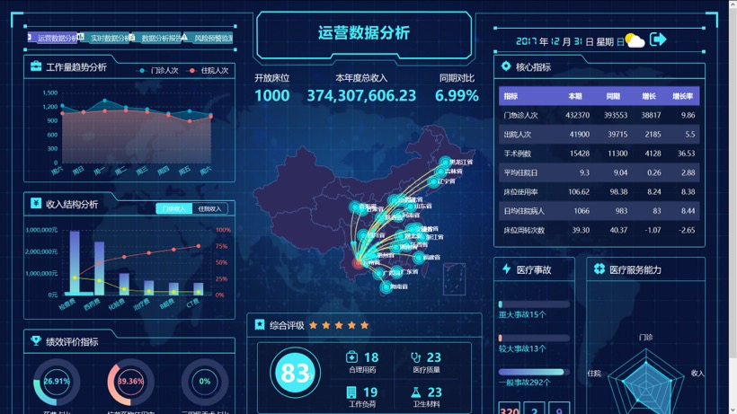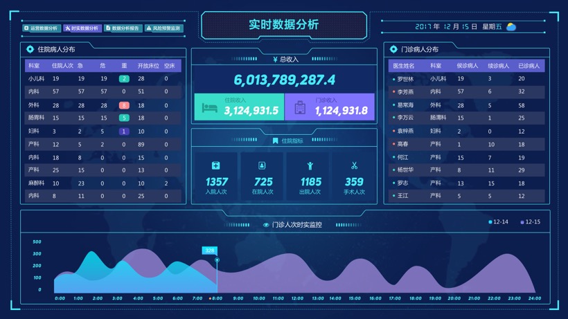 对医院运营的各项基本指标进行实时监测,实时了解医院和各科室的整体运行状况,监测门诊业务和住院业务的核心指标,并提供同比、环比、趋势分析等多种分析方式。支持数据钻取和透视功能,能够全方位展示各级维度数据。